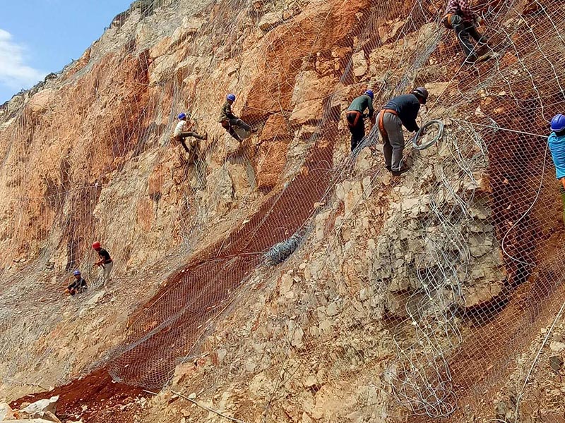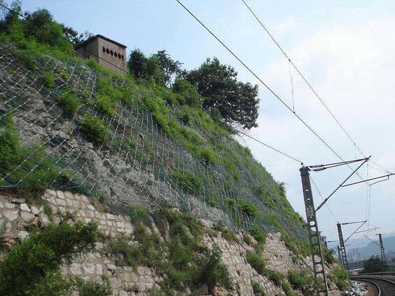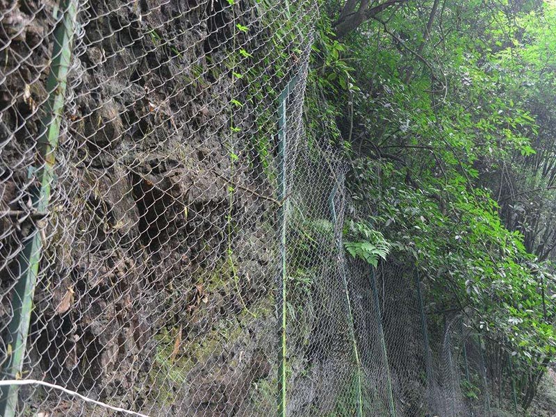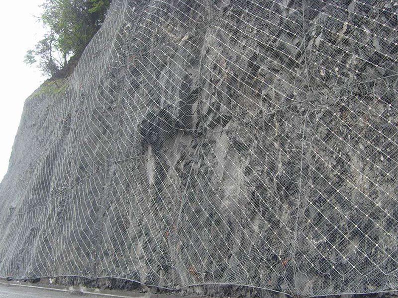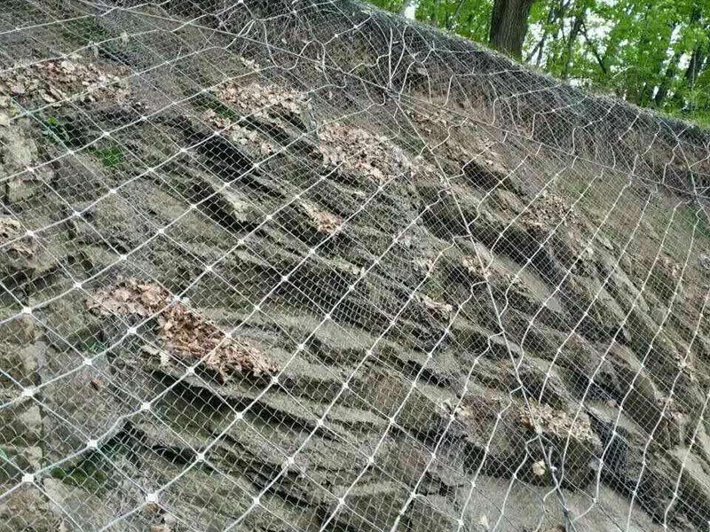 是以鋼絲繩網為主的各類柔性網覆蓋包裹在所需防護斜坡或巖石上,以限制坡面巖石土體的風化剝落或破壞以及為巖崩塌(加固作用),或將落石控制于一定范圍內運動(圍護作用)。